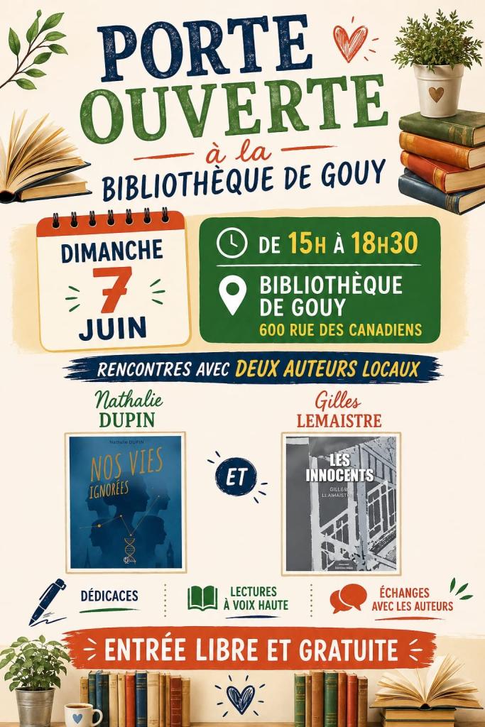La Bibliothèque vous ouvre grands ses portes le Dimanche 7 Juin, à partir de 15h, pour venir à la rencontre d'auteurs locaux, Gilles LEMAISTRE (de Gouy) et Nathalie DUPIN.